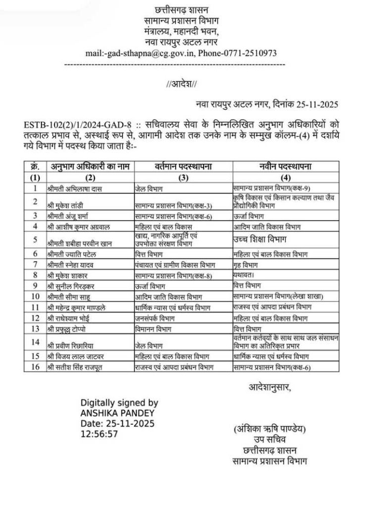 रायपुर। सामान्य प्रशासन विभाग, मंत्रालय ने सचिवालय सेवा के 16 अनुभाग अधिकारियों का विभिन्न विभागों में तत्काल प्रभाव से तबादला कर दिया है।