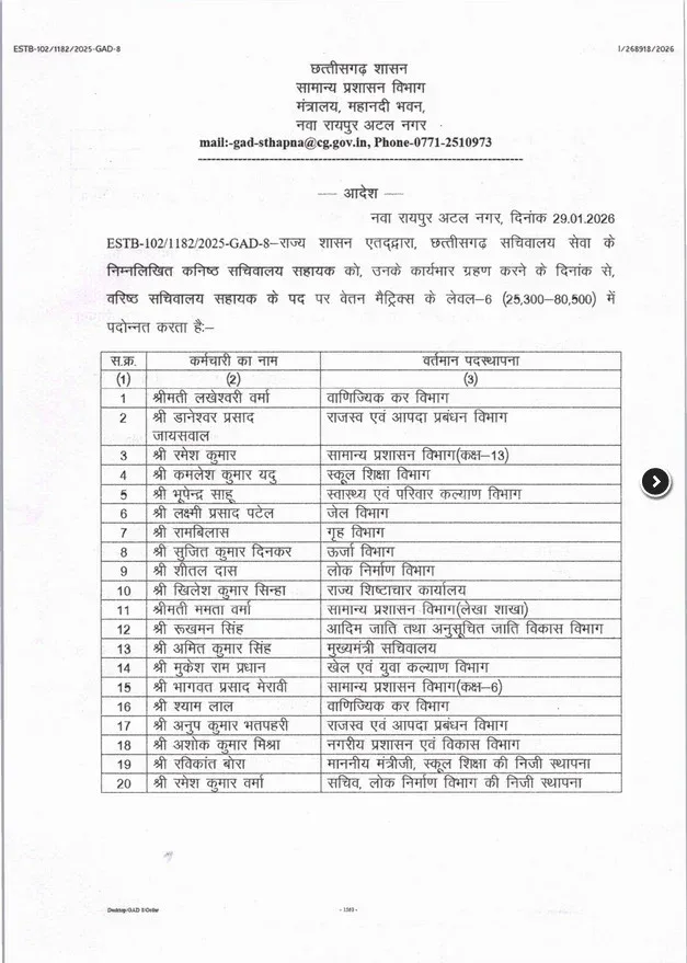 Chhattisgarh छत्तीसगढ़ में 45 अधिकारियों-कर्मचारियों को पदोन्नति 2 hours ago Arvind Rajak रायपुर। छत्तीसगढ़ शासन ने 45 अधिकारियों और कर्मचारियों को पदोन्नति प्रदान की है। सामान्य प्रशासन विभाग की ओर से इस संबंध में आदेश जारी किए गए हैं। About The Author Arvind Rajak See author's posts FacebookWhatsAppXLinkedInEmail Tags: Chhattisgarh News Continue Reading Previous मुख्यमंत्री साय ने सरगुजा ओलंपिक के लोगो और शुभंकर गजरु का किया अनावरणNext महासमुंद के ऐतिहासिक स्थल सिरपुर में 1 से 3 फरवरी तक आयोजित होगा भव्य सिरपुर महोत्सव Related News Chhattisgarh बस्तर पंडुम 2026: बस्तर की समृद्ध सांस्कृतिक विरासत और जनजातीय लोककलाओं के संरक्षण की बड़ी पहल 1 minute ago Arvind Rajak Chhattisgarh महासमुंद के ऐतिहासिक स्थल सिरपुर में 1 से 3 फरवरी तक आयोजित होगा भव्य सिरपुर महोत्सव 30 minutes ago Arvind Rajak Chhattisgarh मुख्यमंत्री साय ने सरगुजा ओलंपिक के लोगो और शुभंकर गजरु का किया अनावरण 6 hours ago Arvind Rajak Chhattisgarh रायपुर में पुलिस की रातभर सघन गश्त, अवैध हथियारों के साथ 23 संदिग्ध गिरफ्तार 9 hours ago Arvind Rajak Chhattisgarh रायपुर में रात्रि गश्त: 23 संदिग्ध पकड़े, चाकू-तलवार बरामद 9 hours ago Arvind Rajak Chhattisgarh छत्तीसगढ़ हाईकोर्ट ने मेडिकल पीजी सीटों के पुराने आवंटन रद्द किए, अब नई काउंसलिंग से ही प्रवेश 10 hours ago Arvind Rajak