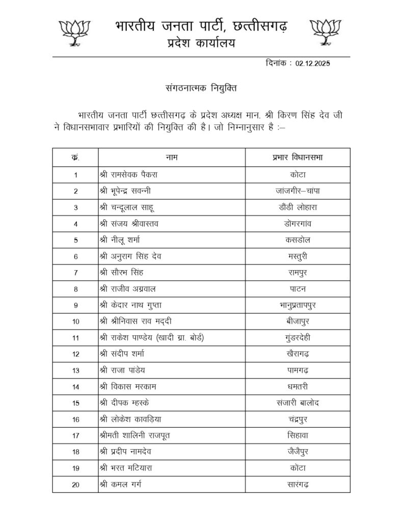 रायपुर। छत्तीसगढ़ भारतीय जनता पार्टी के प्रदेश अध्यक्ष किरण देव ने विधानसभा क्षेत्रवार प्रभारियों की नियुक्ति की है। इस क्रम में राजीव अग्रवाल को पाटन विधानसभा तथा रामसेवक पैकरा को कोटा विधानसभा का प्रभारी बनाया गया है। कुल 36 विधानसभा क्षेत्रों के लिए प्रभारियों की नियुक्ति की गई है।