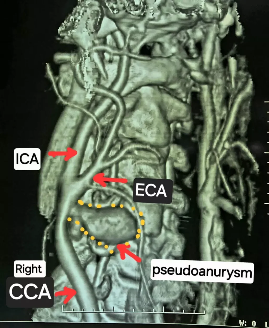 सीटी एंजियोग्राफी जांच में सामने आया कि मरीज की दायीं कैरोटिड आर्टरी फट चुकी है और उसके आसपास गुब्बारानुमा संरचना बन गई है, जिसे कैरोटिड आर्टरी स्यूडोएन्युरिज्म कहा जाता है। स्थिति की गंभीरता को देखते हुए मरीज को तुरंत हार्ट, चेस्ट एवं वैस्कुलर सर्जरी विभाग में डॉ. कृष्ण कांत साहू के पास रेफर किया गया।